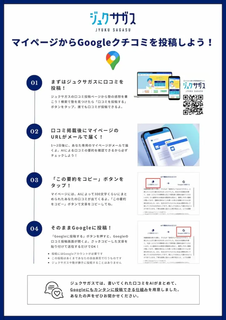 - Googleクチコミ投稿ボタンの表示はGoogleマップに登録されている学習塾様のみが対象です。